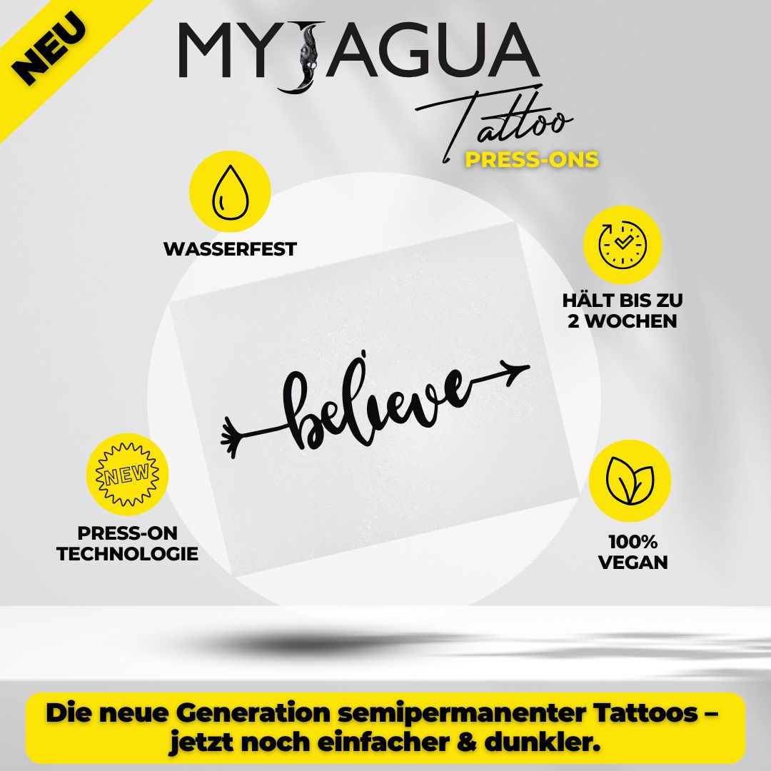 Das Auftragen unseres MyJagua-Tattoos dauert nur 1 Minute. Genieße deinen individuellen Körperschmuck für 1-2 Wochen – ohne Verschmieren oder Abfärben.