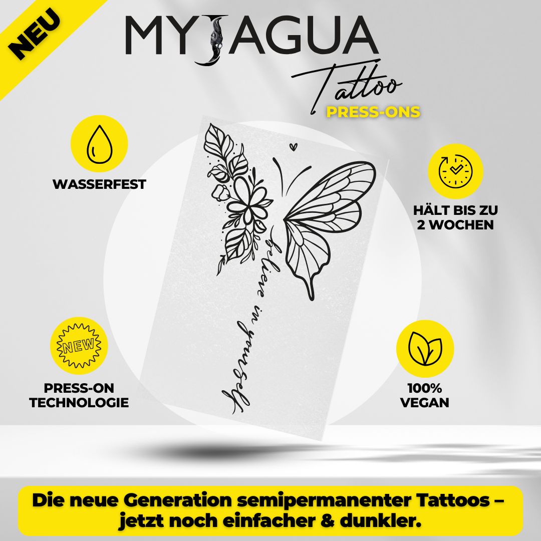 Verschönere deinen Körper mit dem MyJagua-Tattoo, ohne die Schmerzen einer echten Tattoo-Session zu spüren. Unsere semi-permanenten Tattoos halten 1-2 Wochen und bieten dir die Freiheit, Motiv, Größe und Platzierung deines Tattoos flexibel zu gestalten.