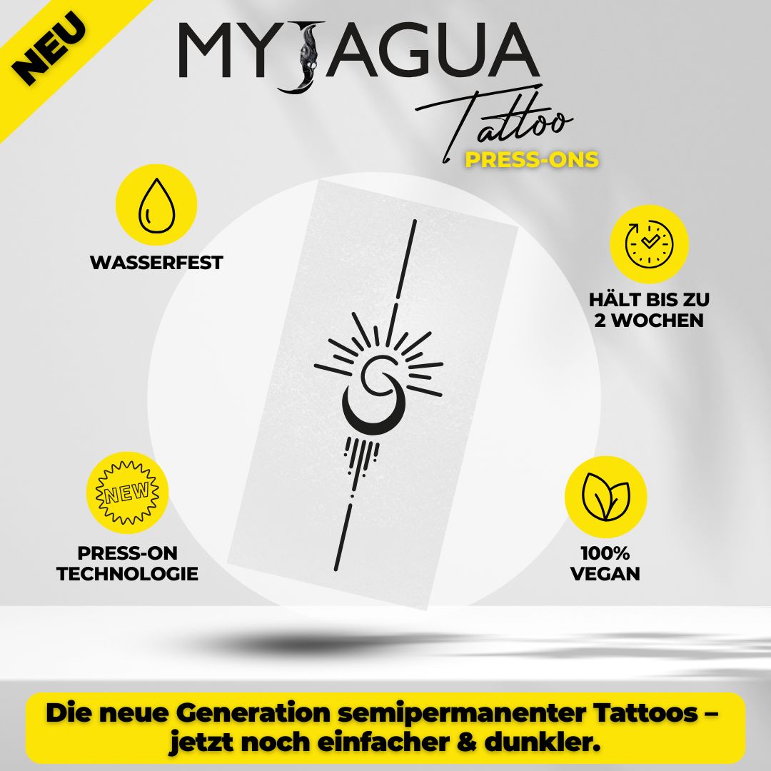 Verschönere deinen Körper mit dem MyJagua-Tattoo, ohne die Schmerzen einer echten Tattoo-Session zu spüren. Unsere semi-permanenten Tattoos halten 1-2 Wochen und bieten dir die Freiheit, Motiv, Größe und Platzierung deines Tattoos flexibel zu gestalten.