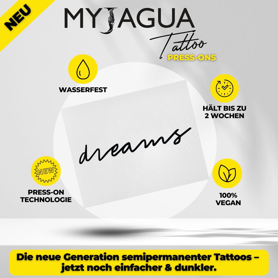 Verschönere deinen Körper mit dem MyJagua-Tattoo, ohne die Schmerzen einer echten Tattoo-Session zu spüren. Unsere semi-permanenten Tattoos halten 1-2 Wochen und bieten dir die Freiheit, Motiv, Größe und Platzierung deines Tattoos flexibel zu gestalten.