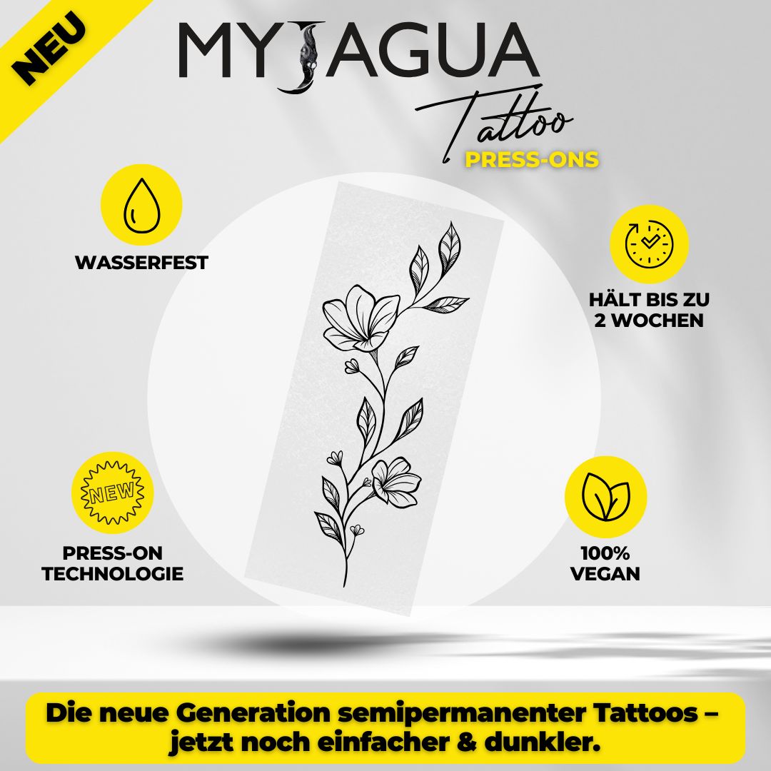 Das Auftragen unseres MyJagua-Tattoos dauert nur 1 Minute. Genieße deinen individuellen Körperschmuck für 1-2 Wochen – ohne Verschmieren oder Abfärben.