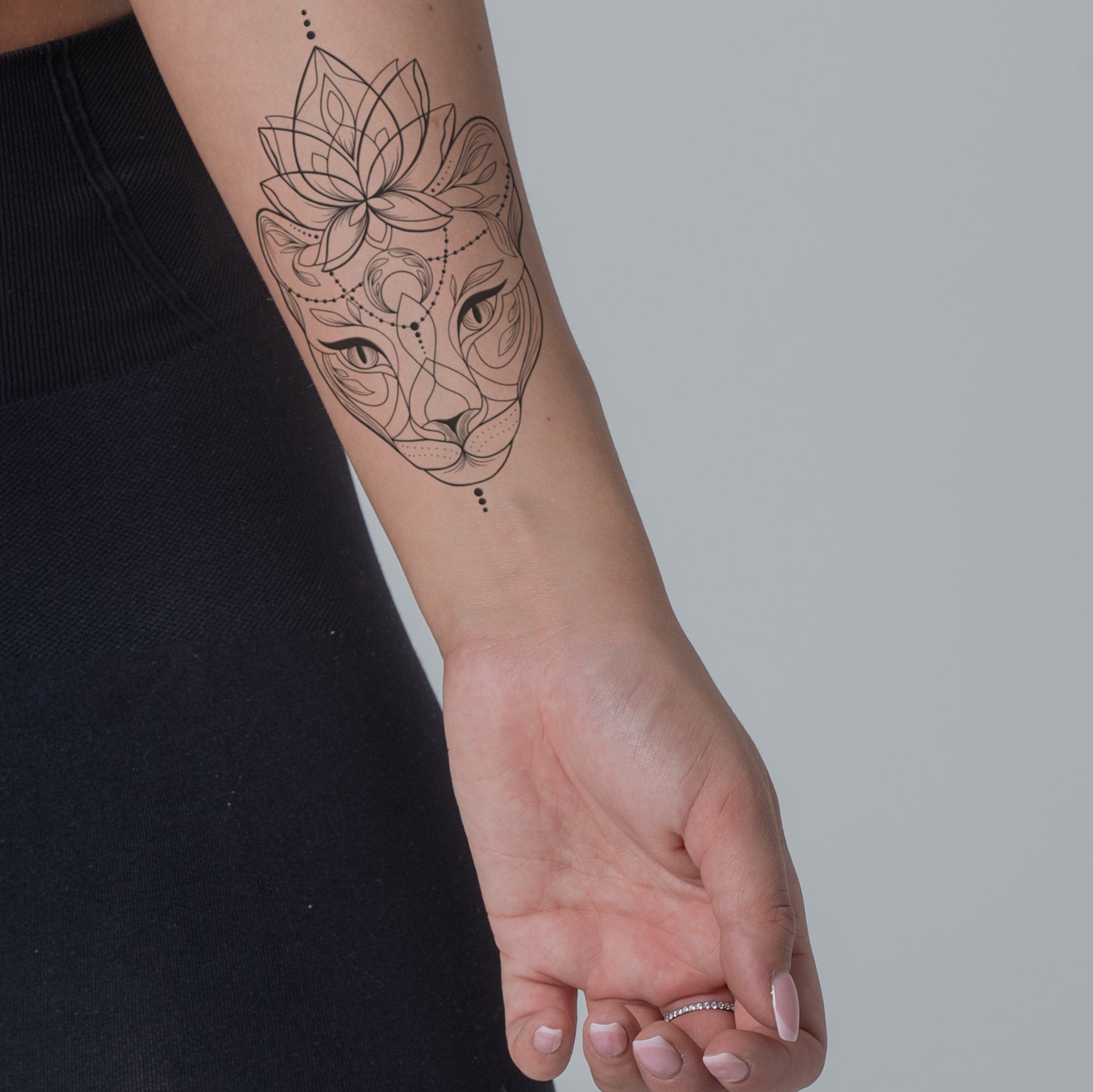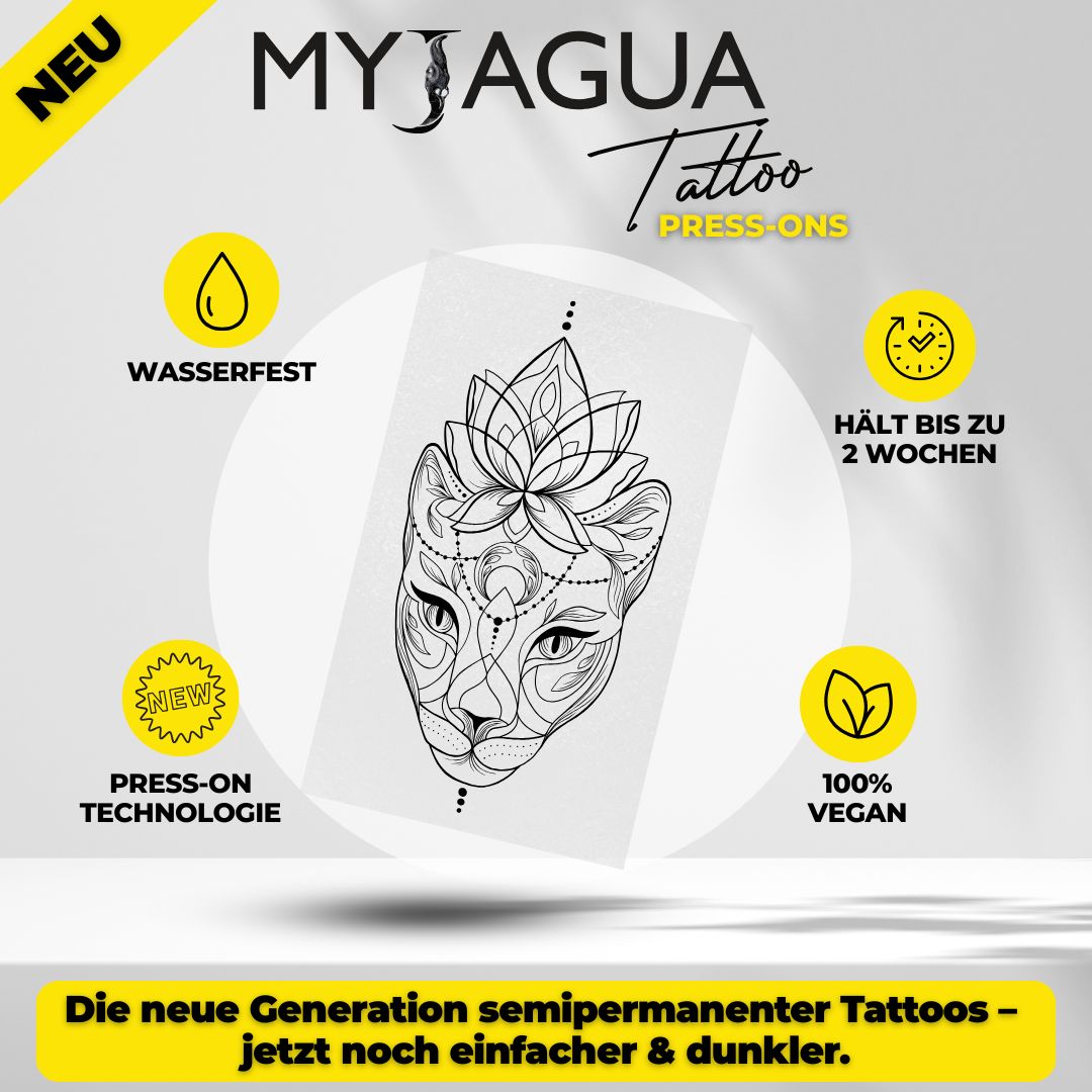Verschönere deinen Körper mit dem MyJagua-Tattoo, ohne die Schmerzen einer echten Tattoo-Session zu spüren. Unsere semi-permanenten Tattoos halten 1-2 Wochen und bieten dir die Freiheit, Motiv, Größe und Platzierung deines Tattoos flexibel zu gestalten.