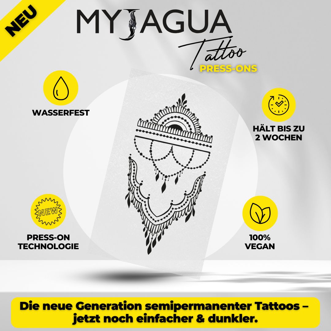Verschönere deinen Körper mit dem MyJagua-Tattoo, ohne die Schmerzen einer echten Tattoo-Session zu spüren. Unsere semi-permanenten Tattoos halten 1-2 Wochen und bieten dir die Freiheit, Motiv, Größe und Platzierung deines Tattoos flexibel zu gestalten.