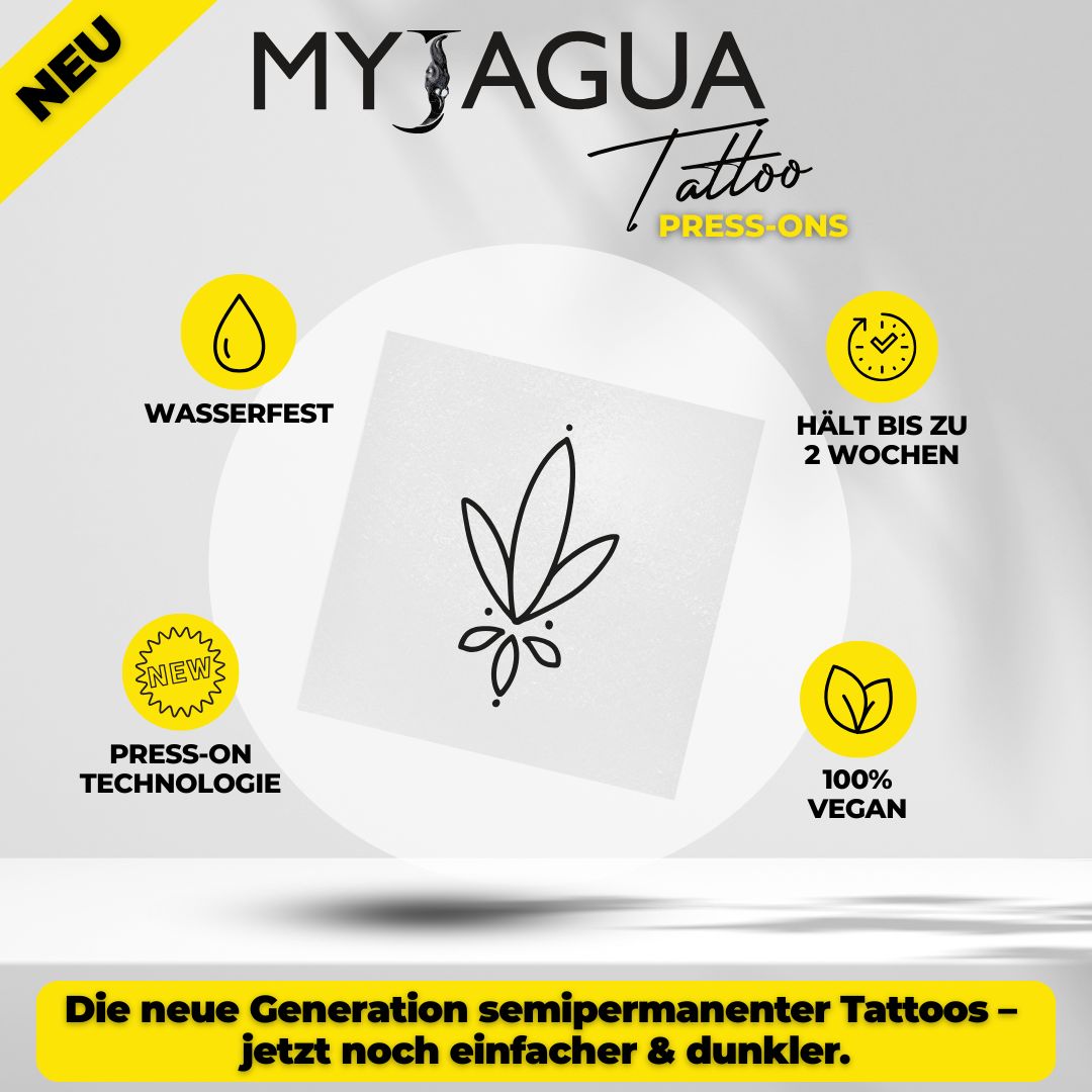 Das Auftragen unseres MyJagua-Tattoos dauert nur 1 Minute. Genieße deinen individuellen Körperschmuck für 1-2 Wochen – ohne Verschmieren oder Abfärben.
