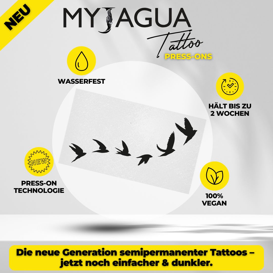 Das Auftragen unseres MyJagua-Tattoos dauert nur 1 Minute. Genieße deinen individuellen Körperschmuck für 1-2 Wochen – ohne Verschmieren oder Abfärben.