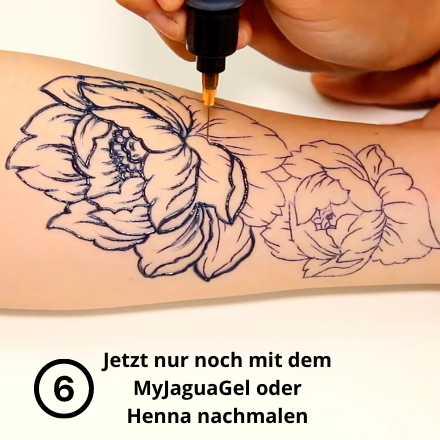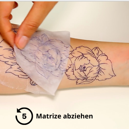 Ziehe das Papier vorsichtig ab – dein Design ist jetzt sichtbar und bereit zum Nachzeichnen mit dem MyJagua Tattoo Stift!
