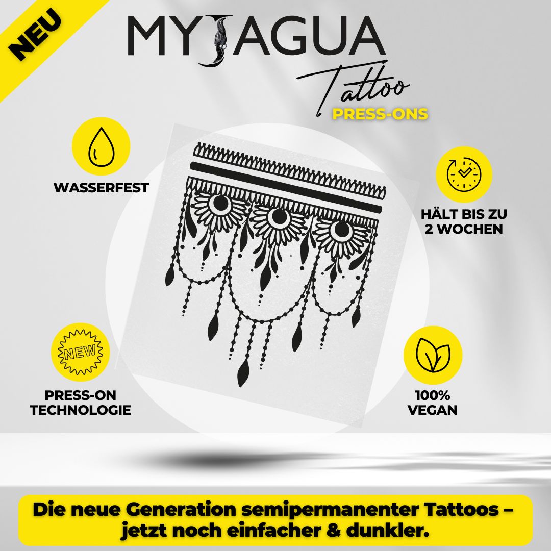 Verschönere deinen Körper mit dem MyJagua-Tattoo, ohne die Schmerzen einer echten Tattoo-Session zu spüren. Unsere semi-permanenten Tattoos halten 1-2 Wochen und bieten dir die Freiheit, Motiv, Größe und Platzierung deines Tattoos flexibel zu gestalten.